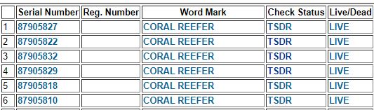 1) The applications were assigned after being filed, which is a little unusual/risky for intent-to-use applications depending on who the assignee is and its relationship to the assignor. Fortunately, language in the assignment, which you can see HERE, suggests that the risk might not be present in this case because the assignment claims that Coral Reefer, LLC, as assignee, is the owner of an ongoing and existing business and successor of the assignor.